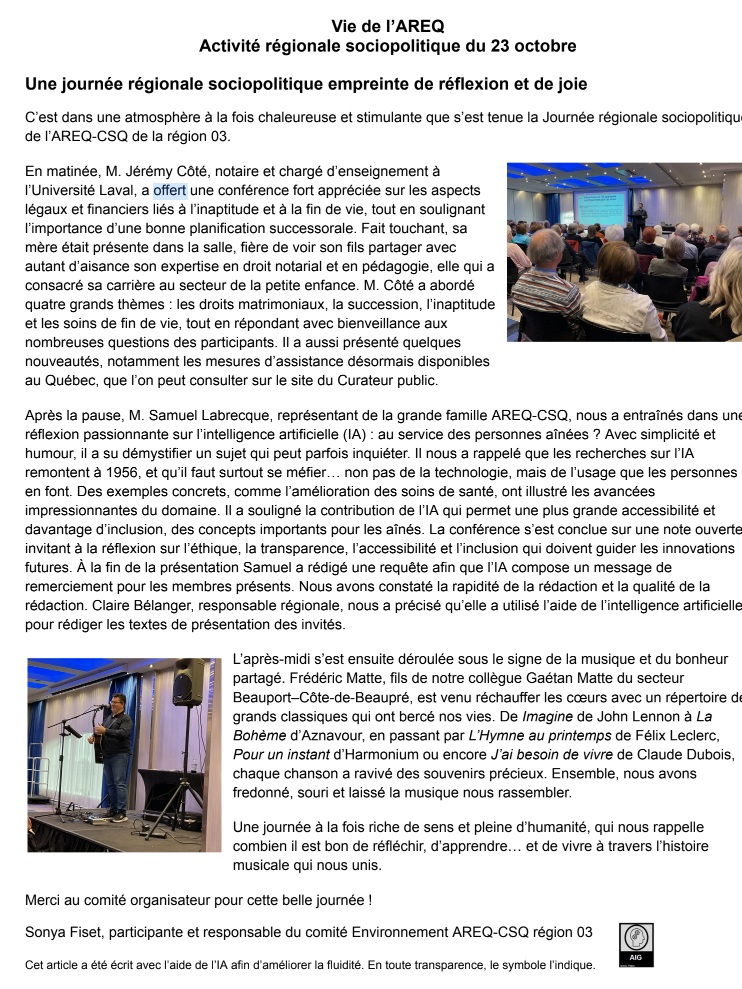 Nous tenons à vous remercier de votre participation au webinaire Vieillissement et mobilité active sécuritaire, présenté par la Société de l’assurance automobile du Québec (SAAQ) et qui s’est tenu le mercredi 3 septembre de 10h à 11h30, sur la plateforme Teams. Continuer à lire…